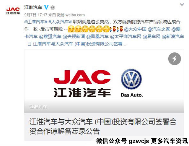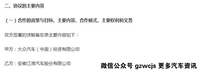 2016年9月7日,江淮汽车发布《安徽江淮汽车股份有限公司与大众汽车(中国)投资有限公司签署合资合作谅解备忘录的通告》。简单来说,就是大众(甲方)与江淮(乙方)正式签订合作协议,将成立大众在华的第三家合资公司。