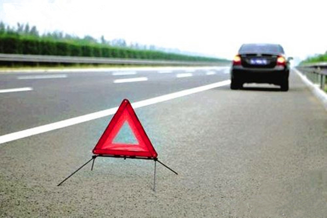 车停稳后迅速下车并在车辆后方设置警示牌,随后人员赶紧行至高速护栏外,打电话请求交警帮助。