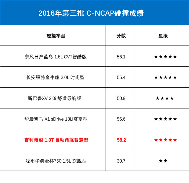 这一批的安全碰撞测试有6款车型进行了参加,其中自主品牌占了2款,合资品牌占了4款。而博越以58.2分的成绩(五星,满分为62分),取得碰撞测试成绩榜单的第一名。此外,博越也是C-NCAP提高标准以后,碰撞成绩最高分的SUV车型。