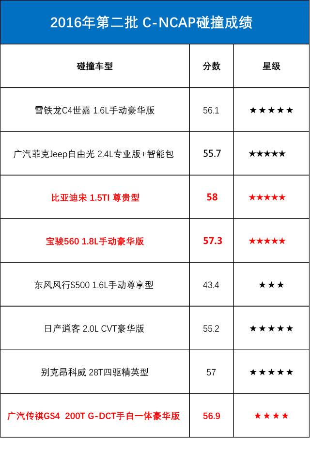 正所谓一个巴掌拍不响,要证明自主品牌在安全性能方面并不比合资品牌差,靠博越一个那是绝对不可能的。不过幸好,有志气的自主品牌可不止博越。在C-NCAP公布的2016年第二批的安全碰撞结果中(也就是上一批),共有2款自主品牌的车型取得到了5星成绩。而最让人惊讶的是,取得58分好成绩的(博越为58.2分),是任谁都猜不到的比亚迪宋。众所周知,比亚迪只在新能源上做宣传,什么操控、安全等字眼基本是不出现在宣称广告上的。忽然间蹦出个五星成绩,确实是吓坏了宝宝。