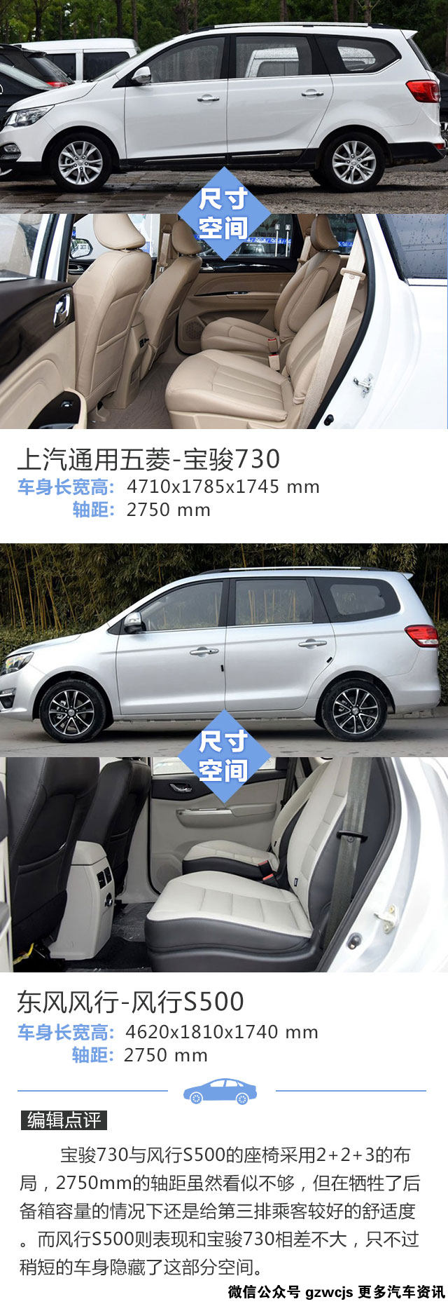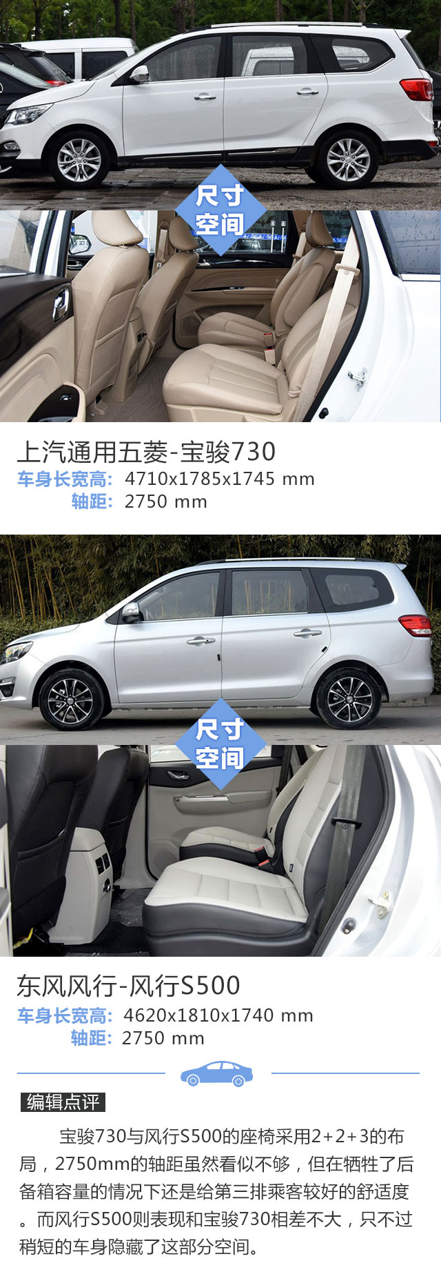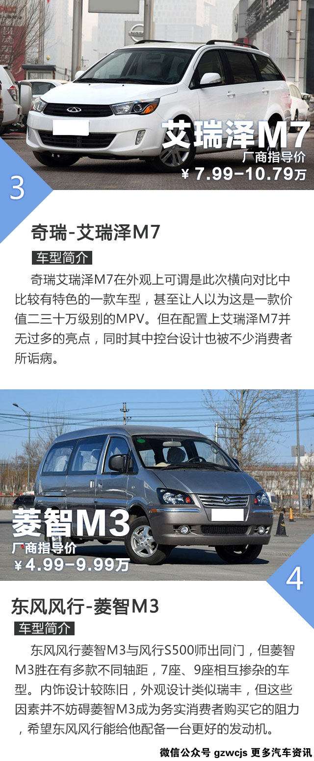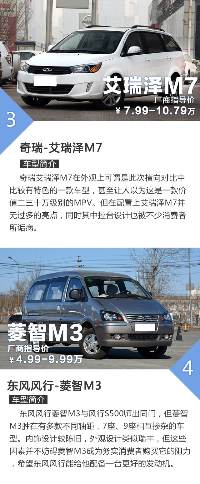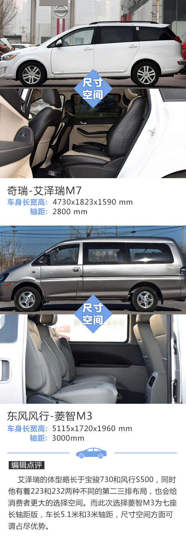 由于本次对比的车型中售价均为接近10万元的车型,而菱智M3在这个价位的七座车型为长轴距版,所以无论是在车身尺寸还是内部空间上,菱智M3都显得游刃有余,外观内饰上的丢分反而使得他在空间上表现最佳,也使得菱智M3的消费群体有别与另外三款车的消费群体。而艾瑞泽胜在二三排布局的选择上,既有223还有232,主要以坐满7人为目的的车主可以选择223布局车型,这样第三排乘客进出显得方便,而偶尔实用第三排座椅的车主选择232布局会更加合适。宝骏730和风行S500相较而言略显平庸,不过也基本可以满足绝大多数需求。