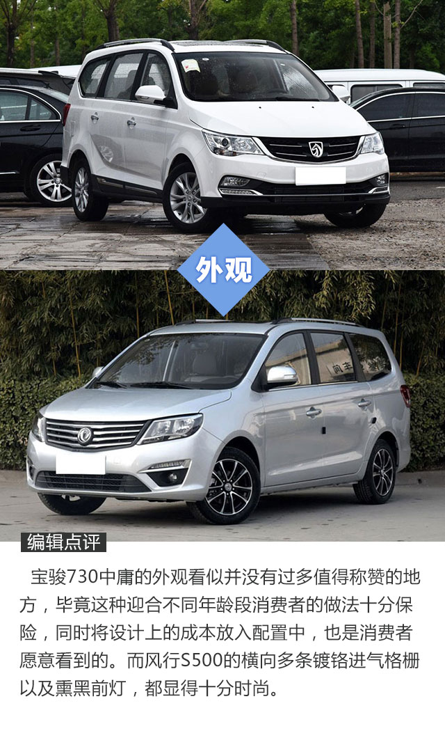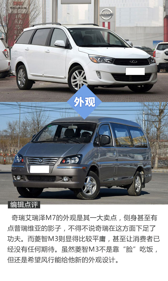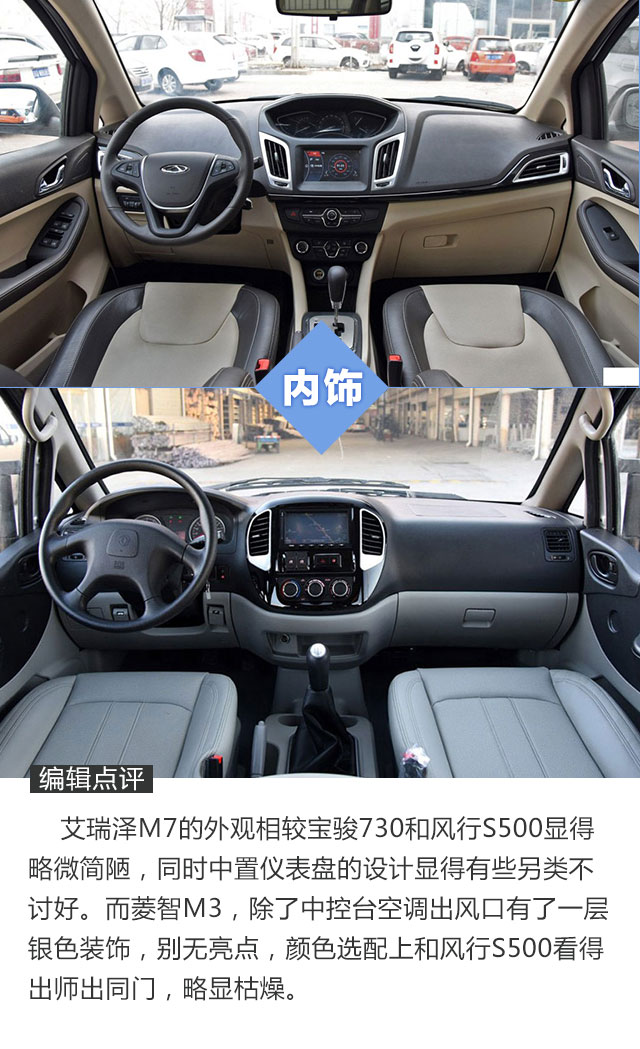 外观方面,宝骏730与风行S500的设计算不上有太多出彩的地方,主要以中庸的形象示人。相较之下,艾瑞泽M7则显得时尚大气许多,或许这种级别的MPV外观设计并不是消费者购车的最主要原因,但是菱智M3的设计未免也显得过于落伍吧。