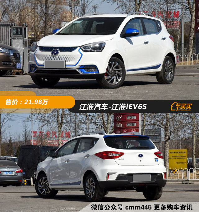 江淮的iEV6S外形设计源自瑞风S2,看上去除了配色不一样外,细节上也有不少变化,进气格栅被取消,镀铬饰条也被蓝色饰条所取代,车头则给人充满力量感的视觉效果,科技感十足,整体看上去车身小巧而精致。