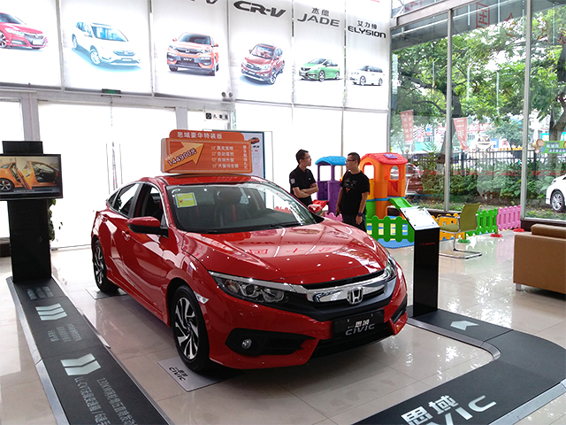 来到了B店,不愧是国企,店面十分宽敞,偌大的落地玻璃前面停着一辆红色的思域,我们走进一看,原来是冯先生想购买的豪华型,我们也忍不住在这里多看几眼了,顺便也在这里和冯先生聊聊购车的那些事。