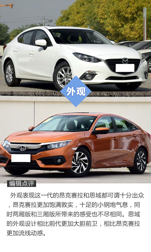 颜值这种东西,在SUV和轿车上体现的不尽相同。XR-V走动感路线,而自由侠多少还有着一些美式的硬汉气息,尽管看起来依然小巧可爱。昂克赛拉外观设计肌肉感十足,赛道范儿十足。虽然第十代思域在外观方面没有其他几款车如此年轻运动,但依然十分动感,更多偏向于家用车。