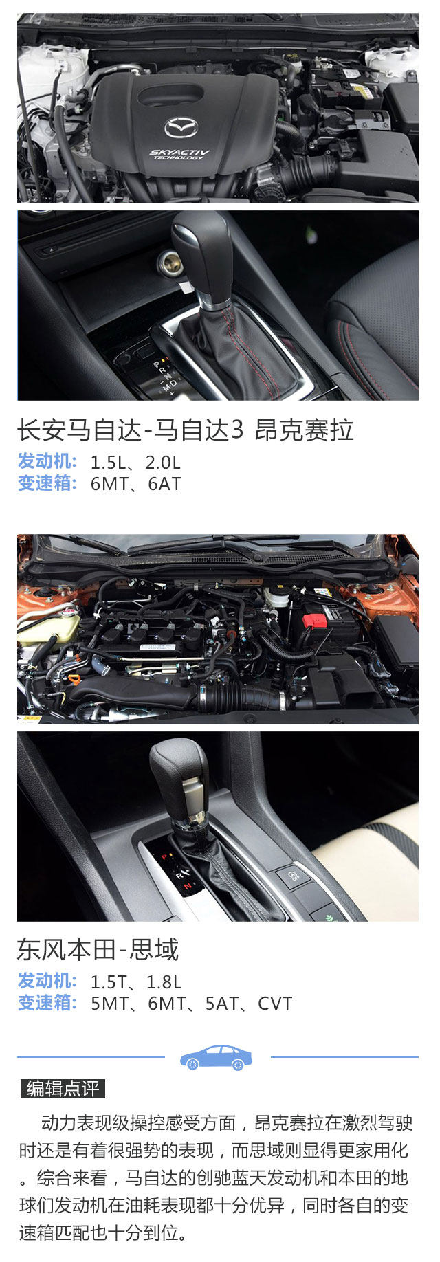 动力表现方面,XR-V由于地球梦发动和变速箱匹配得当,价值本身车身重量较轻,XR-V有着不输与思域的操控感受,动力和油耗都表现的十分优秀,唯一的缺陷可能在于隔音性没那么好,胎噪有点过大。而自由侠整体表现相对较弱,7速双离合变速箱也较为顿挫,使得自由侠行驶品质上不甚理想。而轿车方面,昂克赛拉和思域都表现优异,创驰蓝天发动机和地球梦发动机在动力变现各有千秋,同时也十分省油。综合而看,轿车的油耗还是明显低于SUV。