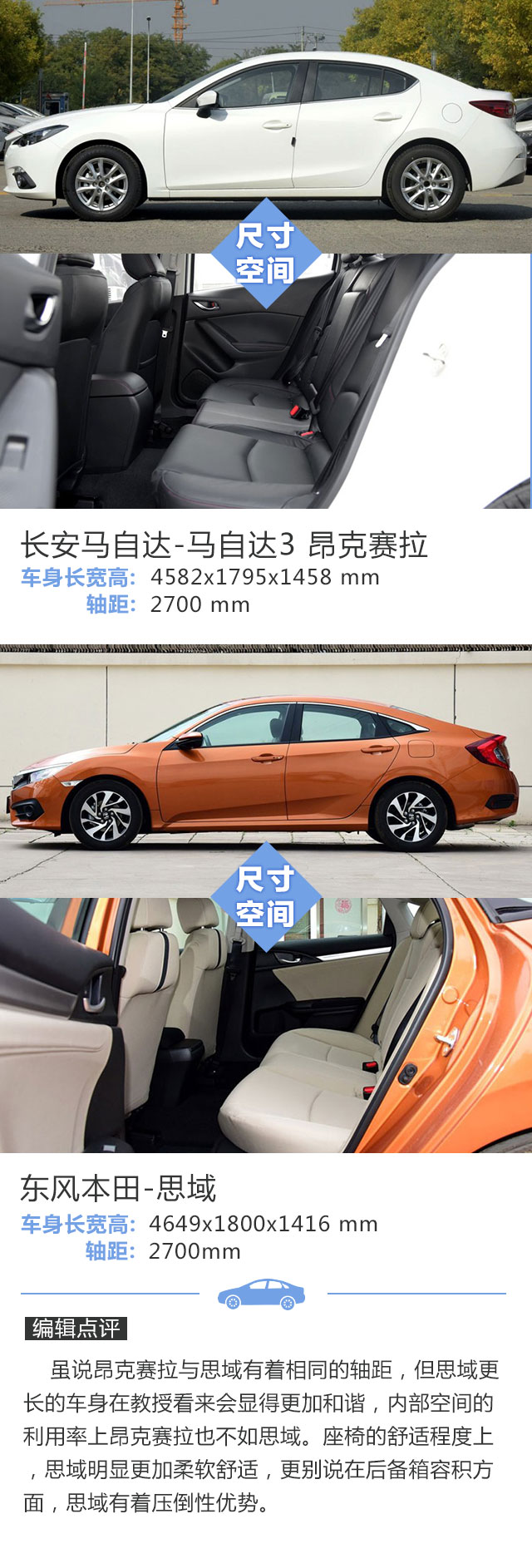 空间方面,SUV车型在车高和底盘高度上有着明显优势,XR-V和自由侠在后备箱空间和乘客头部空间表现尚可,但明显这二者相比较,本田在空间利用率上还是整体强于自由侠太多,真正使得XR-V在小型SUV车型中空间程度达到一种“变态”的地步。而轿车方面,昂克赛拉和思域由于轴距较长,明显在后排乘客的腿部空间方面表现更好,坐姿也更加舒适,只不过昂克赛拉在隔音性和舒适程度上还是略逊于思域。
