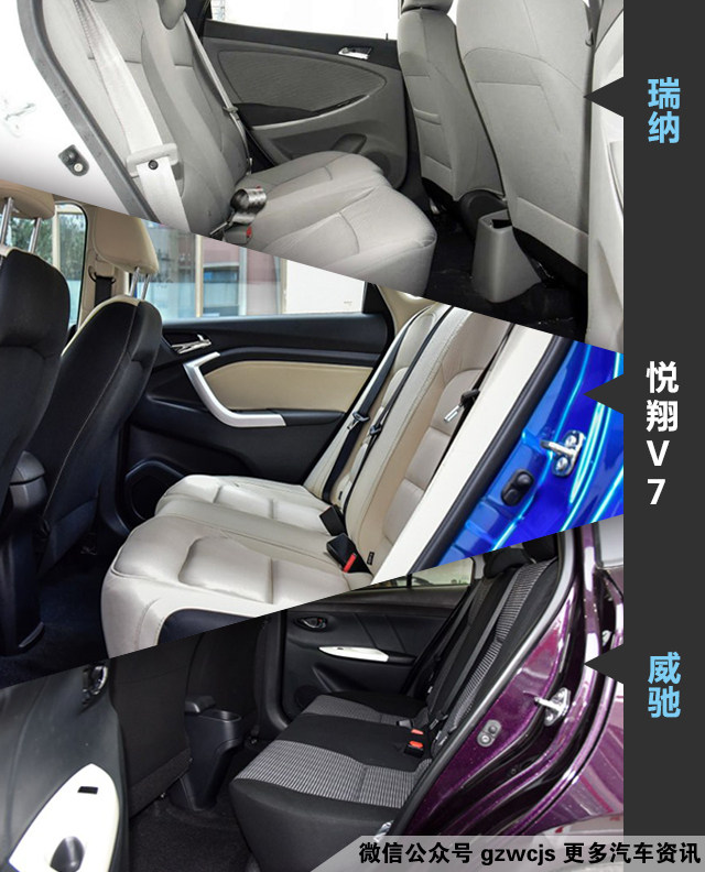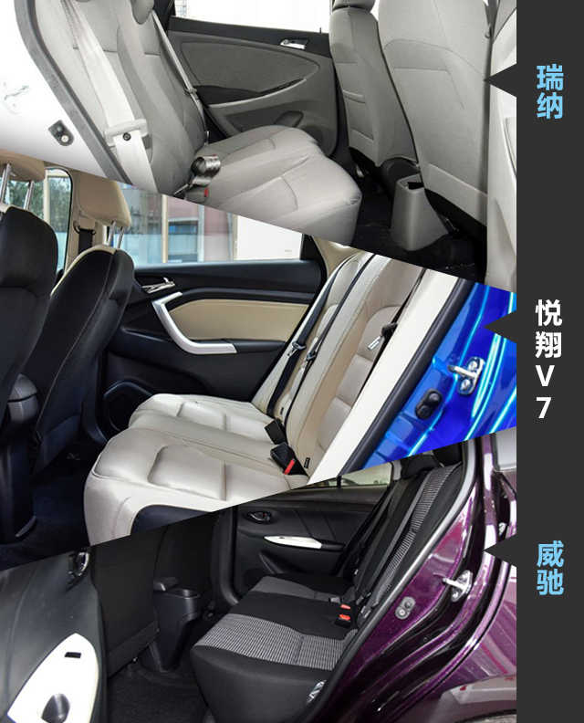 上述表格可以很清楚看到,车身的长宽高,悦翔都比瑞纳和威驰大一圈,而影响后排乘坐空间的轴距,悦翔V7甚至达到2610mm,与卡罗拉、朗动相差不远。实际乘坐过程中,小编180的身高在后排仍有一拳膝部空间,和三指头部空间,这样的空间表现,尚算惊喜。