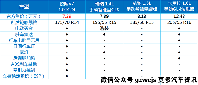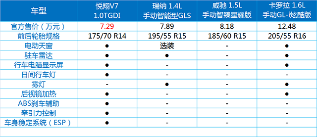 配置表中可以看到,售价相对更低的悦翔V7 1.0TGDI配置更为厚道,除了前雾灯之外几乎全配备,更不乏日间行车灯这样的装逼利器。同比高一档的卡罗拉,配置也丝毫不逊色,真有些越级挑战的意味。