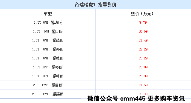 先看一下最低配,一般最低配只是为了拉低售价的,不是什么走量的车型,厂家也几乎没打算卖这类车,不过瑞虎7的乞丐版配置还算可以,但是我更希望把最低配的无钥匙进入换成胎压监测或者气囊之类的安全配置。