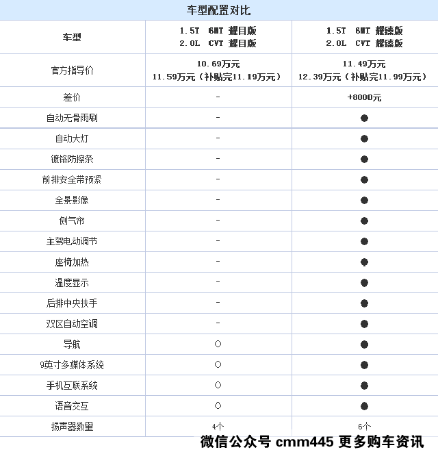 1.5T 6MT/2.0L CVT耀臻版是最推荐的版本,参考耀臻版和耀目版的对比,价格是贵了一点,但是配置多了很多,总结起来就是耀臻版完胜。