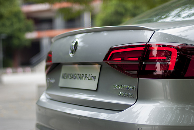 画龙点睛之处就是熏黑的LED尾灯,暗红色的色调,再加上晶莹剔透的实际观感,示宽灯点亮造型非常具有辨识度,如果我在路上遇到速腾R-Line,我会选择尾随,这尾灯实在是太漂亮了。