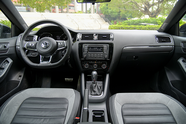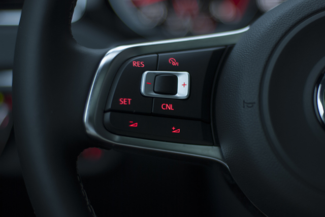 方向盘是整个内饰的亮点,与大众旗下钢炮车型的方向盘造型一样,配以红色的内饰按键背景灯和白色的氛围灯,令整个车厢充满运动气息。定速巡航功能操作区域位于方向盘的左侧,当车速高于20km/h就能够开启,设定续航速度能够以10km/h或者1km/h为单位进行递增或者递减。