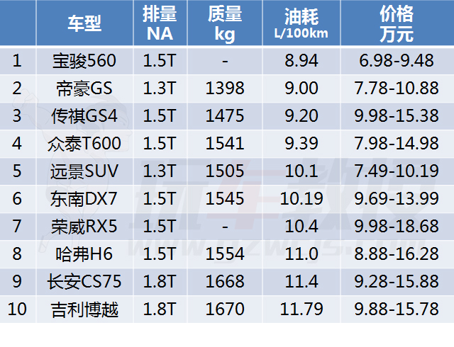 此次数据来源于几百上千名车主的用车实测,百公里油耗为综合路况平均值,其中宝骏560和众泰T600皆为手动挡版本,从图表中的数据简单换算一下,如果油价按照5.6元/升来计算,百公里油耗9L的花费大概是5毛钱每公里,而排量在1.5T-1.8T这个范围,油耗在10.19-11.79L的SUV,大概每公里花费是5.7-6.6元,能够有如此高的燃油经济性,其中与其发动机的热效率,变速箱的传动效率有着密切的关系,虽然这次排行的自主品牌SUV的排量并没有统一,但是我们姑且按照最低油耗往最高排量排起。下面我们来简单讲解一下这10款车分别用的是什么发动机技术。