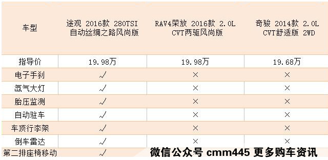 当然RAV4荣放和奇骏都有途观丝绸之路版没有配备的一键启动、电动天窗、电动折叠后视镜和多功能方向盘等配置,但是这些配置只能算是锦上添花,虽然这些增加档次的配置比较多,但是小编依然不能接受没有胎压监测没有氙气灯没有倒车雷达这些安全性实用性配置的事实。高速发飘车身单薄也就不多说了。