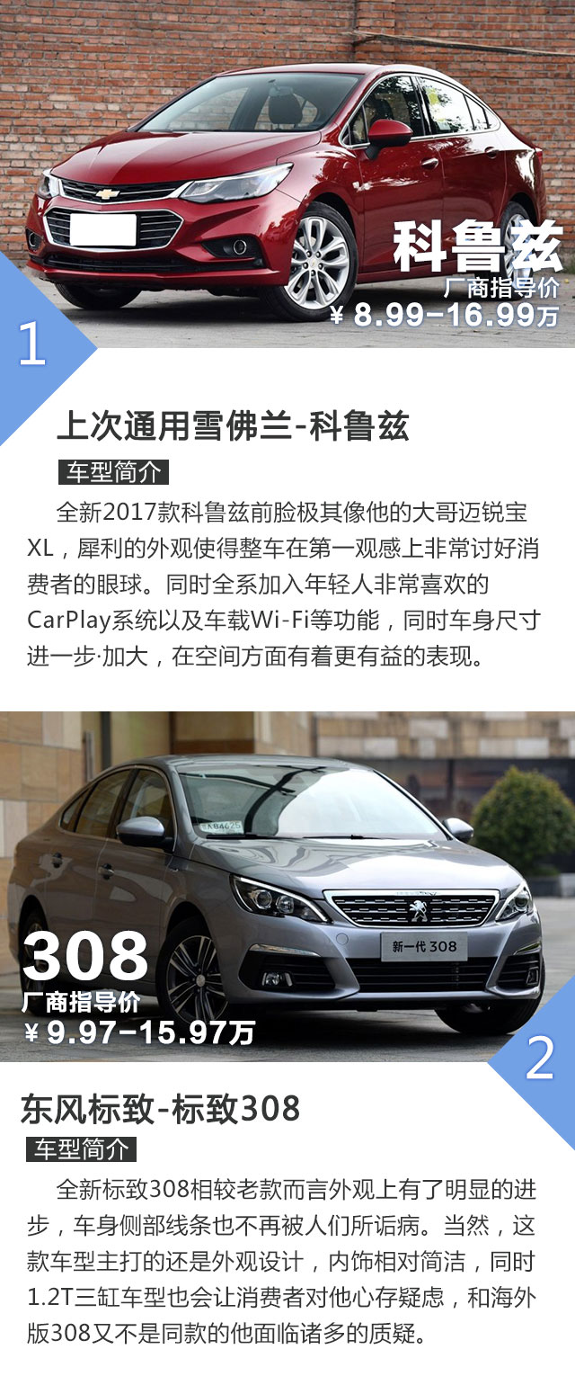 十多万,去除日系车,还有这个价位的销量冠军朗逸和英朗,总体上他们虽不像新款新款科鲁兹和标致308外观那般经验,在整体保值和维修成本上,朗逸和英朗还是有着不错的表现。当然,追求个性选择科鲁兹和标致308都不会错!
