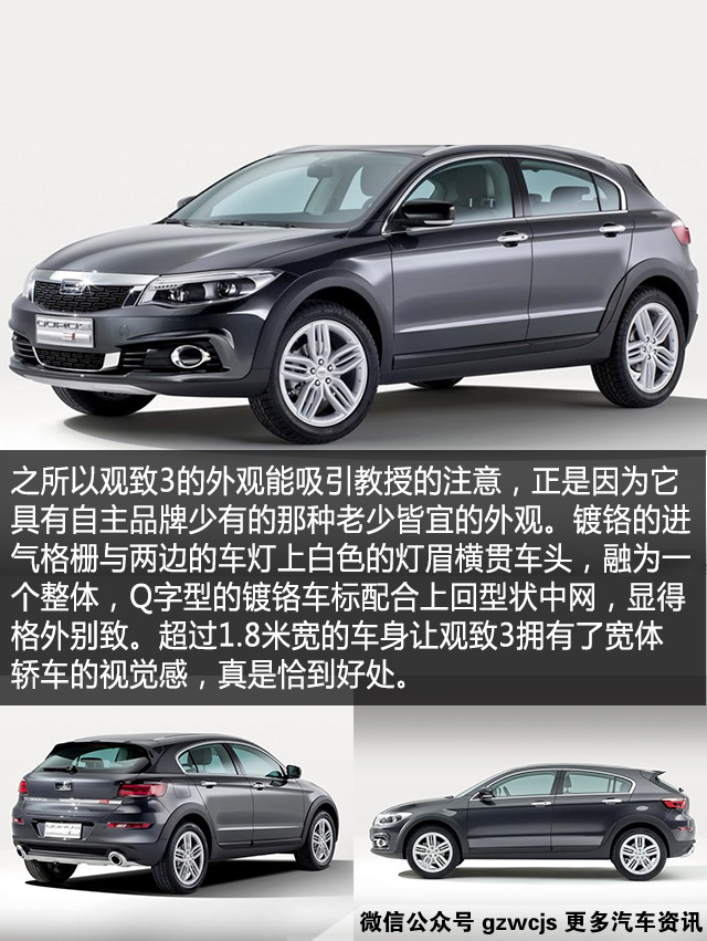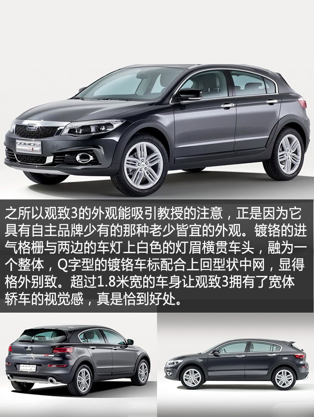 要数自主品牌里面颜值高的,我想奇瑞旗下的观致3绝对能排上榜,来自MINI的设计师功力可以说功不可没,反正是挺符合教授这种屌丝胃口。其实在我们媒体圈对于观致3的评价还是蛮高的,它是第一辆获得E-NCAP碰撞测试五星评级的车型、由以色列集团操刀的底盘调校使得整车的表现真的不输合资车。