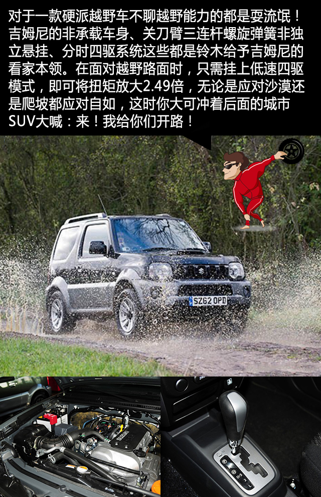 1、硬派越野车的受众面本来就小,再加上这样的迷你身材,无疑是雪上加霜,若非是对越野有极致要求并且喜欢不走寻常路的童鞋,否则一般都不会关注吉姆尼。