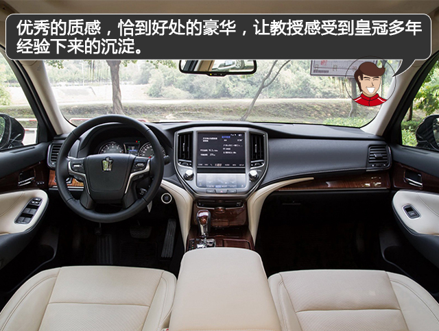 内饰方面,对称式的布局看起来十分中庸和商务化,但中控台的双屏触控和叠层流线的设计,有为该车增添不少的科技感。内饰材料是“上硬下软”的分布,保证了优秀触感的同时又适当控制了成本。优秀的质感,恰到好处的豪华,让教授感受到皇冠多年经验下来的沉淀。