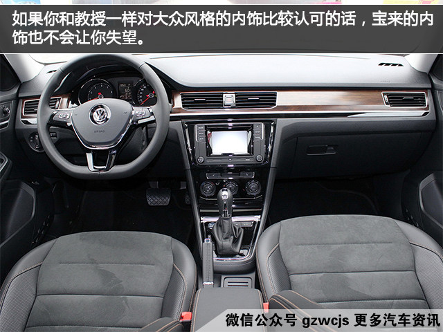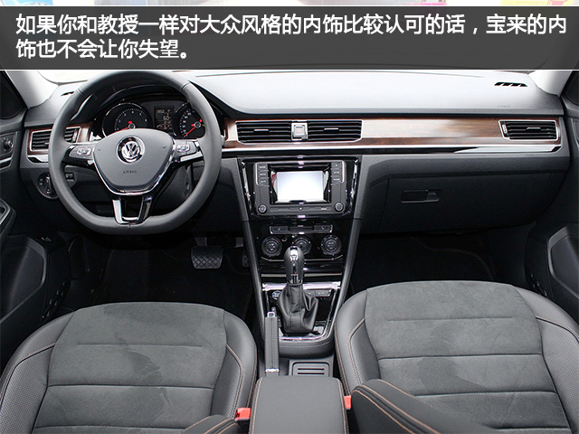 内饰上依然是平直、干练的大众风格,虽然主要材料为硬质塑料,但高配车型中的木纹饰板和钢琴烤漆面板的加入,也让内饰的高级感增加了不少。中控的5英寸屏搭载了MIB信息娱乐系统,尺寸确实小,但常用的多媒体功能还是可以满足的。如果你和教授一样对大众风格的内饰比较认可的话,宝来的内饰也不会让你失望。