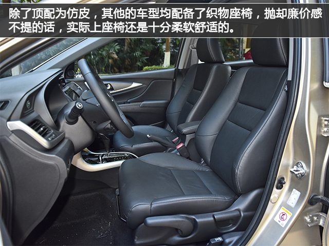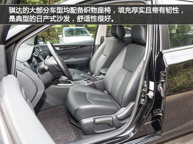 骐达的大部分车型均配备织物座椅,填充厚实且带有韧性,是典型的日产式沙发,舒适性很好。身高172cm的体验者在后排也有两拳的腿部和一拳两指的头部空间,也算是比较给力的空间表现了。