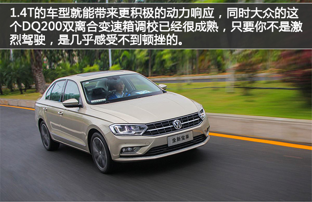 动力方面,宝来的自动挡车型为1.6L+6AT和1.4T+7速双离合的动力系统,最大马力分别是110PS和131PS,1.6L的动力还是够用的,且6AT会比较平顺,实际上是不愠不火吧,而1.4T的车型就能带来更积极的动力响应,同时大众的这个DQ200双离合变速箱调校已经很成熟,只要你不是激烈驾驶,是几乎感受不到顿挫的。如果你觉得D挡的油门确实迟钝,那拨到S挡相信就能给你更过瘾的驾驶感受。