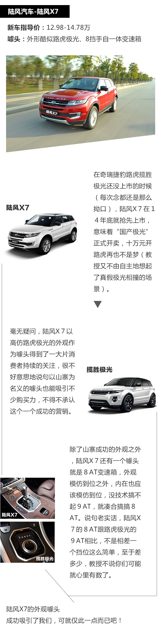 上述车型要说让教授选一台,那么必然是传祺GS4,抛开销量不说,这确实是一台好用的家用SUV,不俗的空间以及大气时尚的外观。至于比较让人担忧的双离合变速箱,只要你不是那种经常大脚油门或者不太追求驾驶的性格,并不需要产生太多的顾虑。