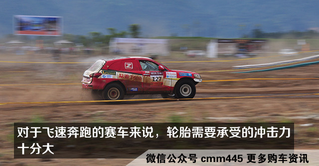 轮胎是和路面接触的地方,越野赛场的路面可不一般,看似平坦实际上尖石粒到处都是,而越野赛车需要以70km/h左右的高速度碾压路面,因此轮胎的耐用性十分重要,而且在泥地、沙地也需要轮胎提供足够的抓地力,在车辆飞跃的时候轮胎也需要承担并缓冲巨大的冲击力。所以再强的越野车,如果轮胎不行,那么也是白搭。