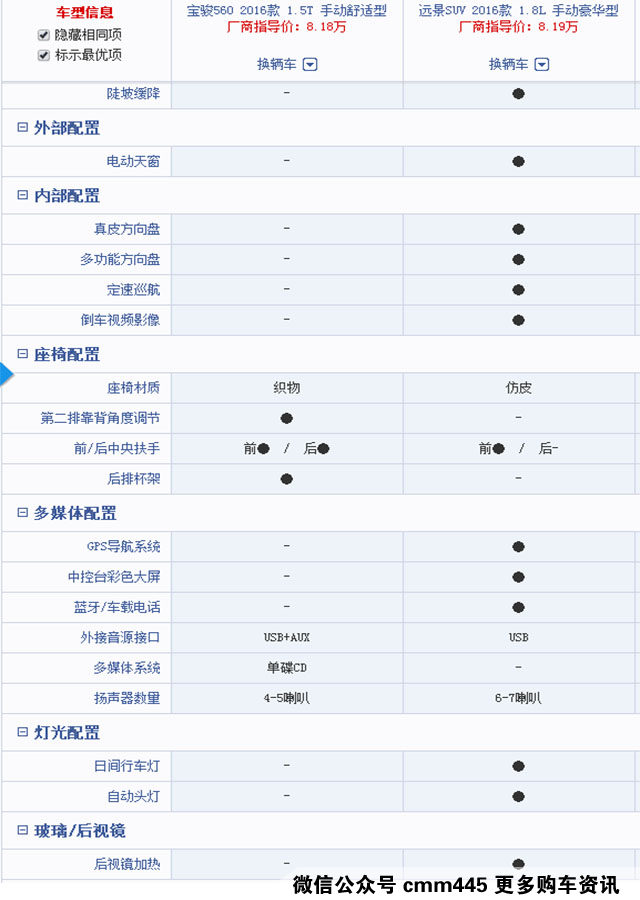 选取的两款车分别为 宝骏560 2016款 1.5T 手动舒适型,指导价:8.18万 和 远景SUV 2016款 1.8L 手动豪华型 ,指导价:8.19万,因为这两款车售价几乎一样,同时也是关注度较高的两款车。所以就拿它们做比较。