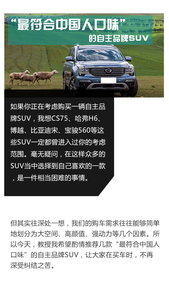 作为国货SUV,H6无疑是领军人,因传承国人中庸思想,在产品的销售上占了先机。加上国人都好随大流,在选择上最终会屈服于销量。然而随着精品车型的不断出现,国货的口碑越来越好,像吉利,长安、传祺等车企在产品设计、品质控制等方面的进步都是消费者看得到的。至于以上4款车个人更看好GS8。大就是美,更何况它本身也确实不错。