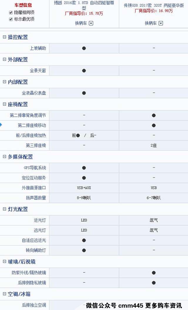 为了公平起见,所取的车型分别是官方指导价为15.78万的吉利博越 2016款 1.8TD 自动四驱智尊型,以及官方指导价为16.98万的传祺GS8 2017款 320T 两驱豪华版,两者仅仅相差1.2万。从配置中可以看出,吉利博越是完胜传祺GS8的。两者在舒适性配置中相差不大,而在主动安全配置上,吉利博越明显优于传祺GS8,而且作为次低配的传祺GS8并没有全景摄像头,在某些情况下庞大的车身着实需要更高车技。