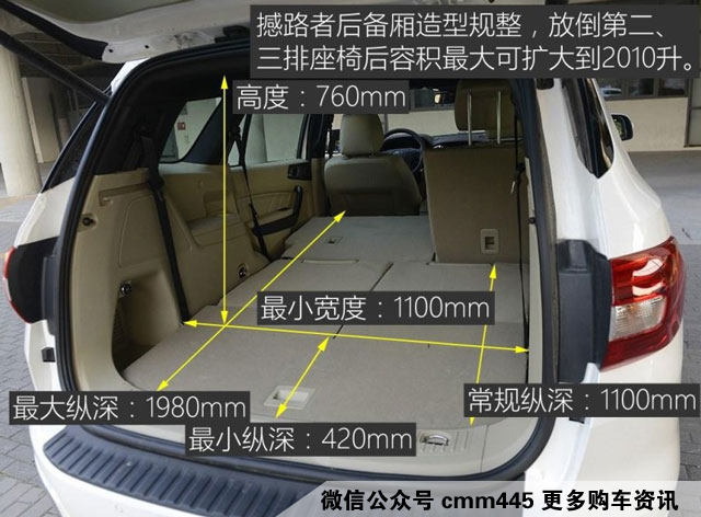 在乘坐空间方面,非承载式车身离地间隙高,客观上影响了乘客舱的乘坐空间,所以第三排位置,头部空间其实都比较局促,但坐两个成年人也是完全没有问题的,相对而言横向空间比较充裕了,驾驶员的活动空间也很大,如果第二排和第三排座椅放倒,后备箱的容积还是相当可观的,搬家塞个柜子也是没问题的,至于还能做什么,你们就自己发挥想象了!陡坡缓降、胎压检测装置、上坡辅助、等丰富配置!
