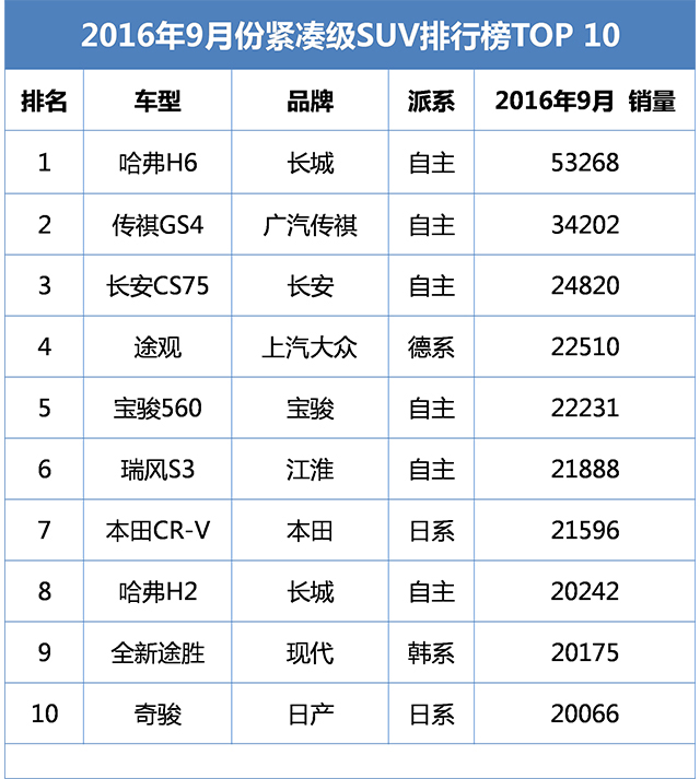 【总结】如今国内SUV市场的火爆可谓是无人不知,而这当中自主品牌的崛起也让我们为之欣慰,哈弗H6在竞争激烈的15万级别SUV市场更是创下了5.3万的销量神话,15万这个价格分水岭既能选择以上这些优秀的SUV也能选择性能平庸的合资品牌轿车,具体怎么选还得看你们怎么选择,但在教授看来上述的自主品牌的车辆他们在拥有不输合资车的驾乘质感的同时价格还更有优势,各位同学在选车是不防多留意他们一下。