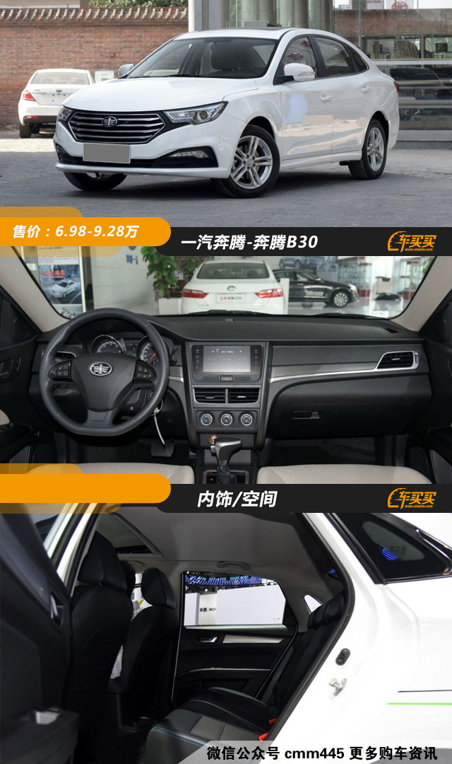 奔腾B30的诞生无非就是为了细分市场的兴起,是一款定位紧凑型车的入门级产品,前两设计非常的个性夸张,偏向于年轻运动化的设计风格,飘逸的腰线很有特点;内饰看起来很规整,实用为主,没有太多花哨的地方,胎压监测、上坡辅助、定速巡航、倒车影像等配置比较齐全;2630mm轴距带来的空间感受还是蛮宽敞的,储物空间设计也比较到位,中控台底部空间和杯架深度合理,满足家用需求;1.6L发动机技术成熟,最大功率109马力,搭配5挡手动或者6挡手自一体变速箱,日常驾驶很顺畅,底盘整体感强。