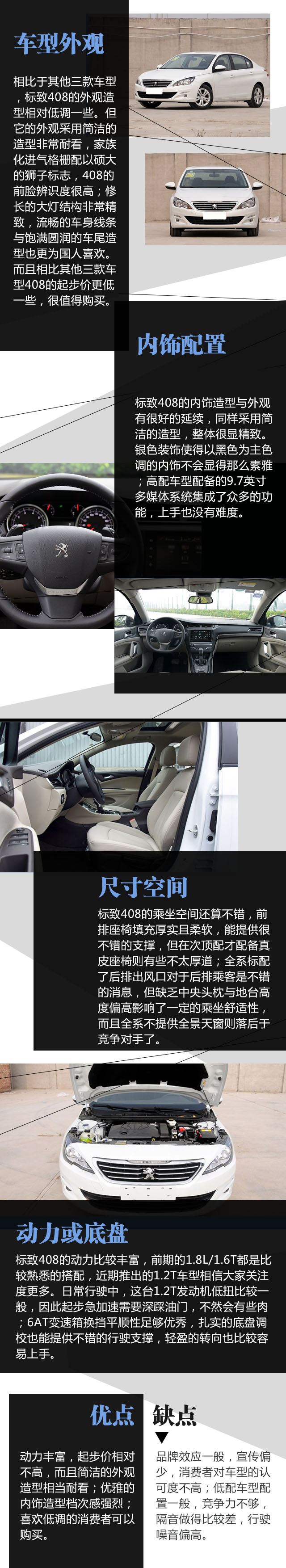 标致408虽然目前热度稍微低了一点,但优雅的外观与内饰造型使得它虽然低调,但却非常耐看;不到13万的起步价与表现均衡的车内空间,对于那些不追求特立独行的消费者是不错的选择;最后介绍的DS 5LS由于定位较高整体性价比比较一般,但豪华的内饰用料与优雅的外观造型,受限于品牌的知名度,终端优惠再大一些会是一款不错的车型。