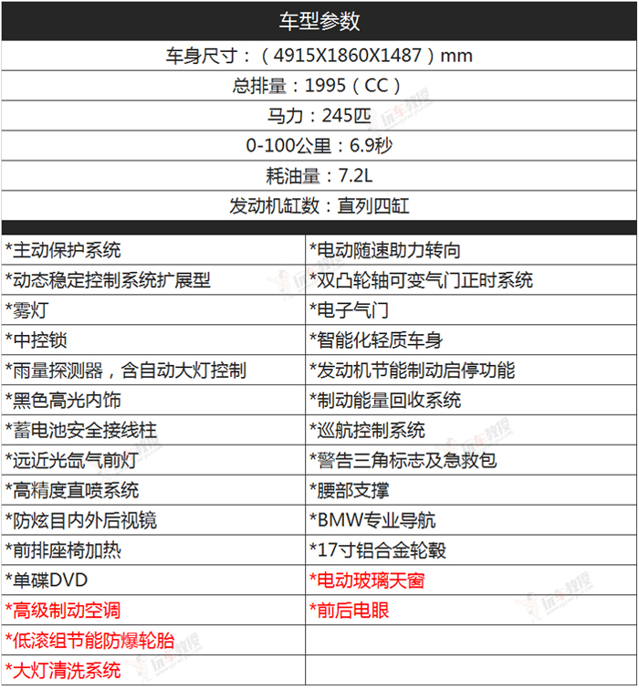 答:配置属于中配,除了标准配置外,主要的配置是:主动保护系统;动态稳定控制系统扩展型;雨量探测器(含自动大灯控制);远近光疝气前灯;高精度直喷系统;防炫目内外后视镜;大灯清洗系统;电动随速助力转向;双凸轮轴可变气门正时系统;电子气门;智能化轻质车身;发动机节能制动启停功能;制动能量回收系统;腰部支撑;17寸铝合金轮毂;电动天窗;前后电眼等。