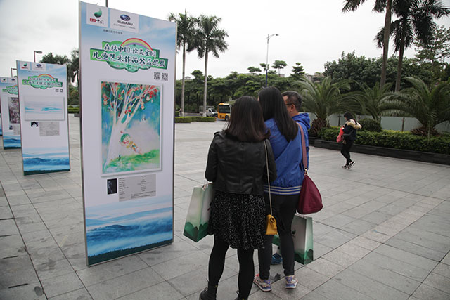 在本次广州白云万达广场上,“2016森林中国•绘美家园儿童艺术作品公益巡展”进行了为期5天的露天展示,其展出的画作不仅内容极为丰富,而且来源也很广泛。其中就有今年“森林中国·绘美家园儿童艺术作品展”活动历时半年从全国35473幅儿童生态题材参选作品中甄选出的优秀作品,也有森林中国绘美家园松花湖公益写生活动中特邀画家的写生作品,更有前不久森林中国参加联合国总部“拯救地球”绿色团艺术展的中国知名艺术家作品,此外还包括森林中国·远行家的自驾和公益活动以及战略公益合作伙伴斯巴鲁汽车(中国)有限公司“31座森林星之旅”第四季活动的精彩记录照片。丰富的展出作品以生动、有张力的艺术表现手法感染和打动了众多参观者,也唤起了更多民众对自然与生命的共鸣、对保护生态环境的责任感。