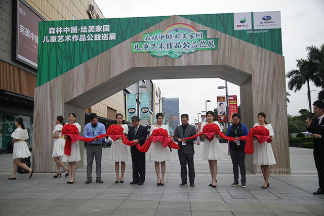 这里就是森林中国以“生态•健康•孩子”为主题举办的“2016森林中国•绘美家园儿童艺术作品公益巡展”最后一站的活动现场。有来自包括森林中国组委会、广西花坪国家级自然保护区管理局、桂林生态诗书画摄影研究院和战略公益合作伙伴斯巴鲁汽车(中国)有限公司广州分公司的领导、专家以及各大媒体人士百余人出席了公益巡展的开幕仪式,各方代表在发言中充分肯定了森林中国在森林生态保护方面所做出的切实贡献和积极社会影响,同时也祝愿本次公益巡展取得圆满成功。