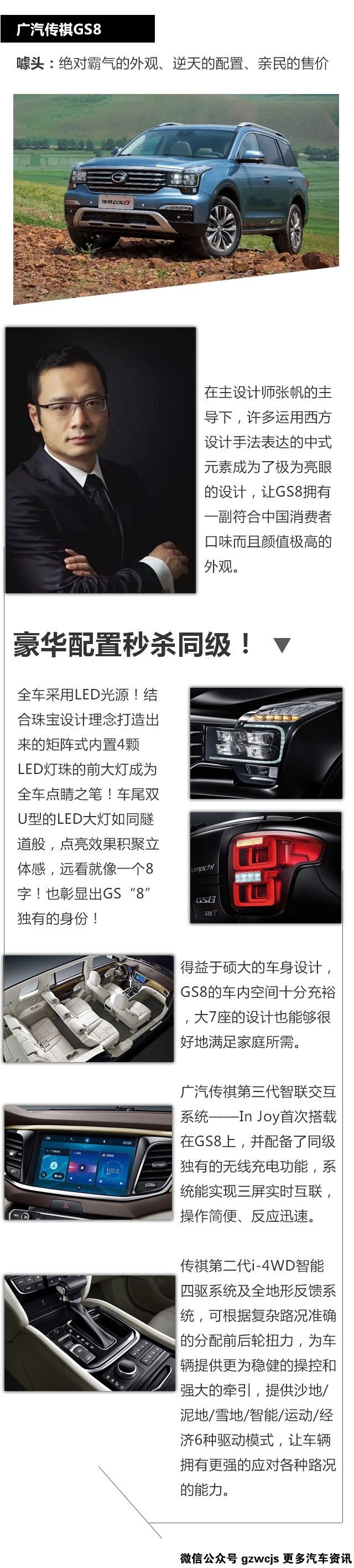 广汽传祺GS8的售价为16.38-25.98万,分为精英版、豪华版、豪华智联版(2/4驱)、尊贵版(2/4驱)共6个车型选择,而其中教授认为性价比最高的车型为豪华智联版本!就像上文教授所发过的配置表,LED大灯、无钥匙进入+一键启动、自动驻车、全景天窗、电动座椅、全景影像、座椅加热/通风、中控大屏幕等得...天呐,配置太高了!另外喜欢越野的朋友也能加13000去选择四驱版本,性价比一样高!