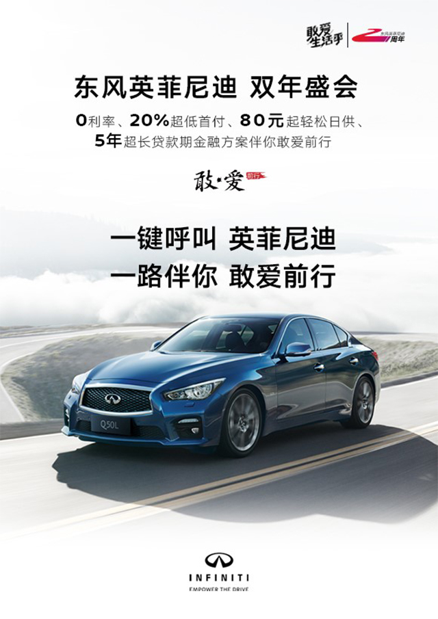 最重要的是,如果体验过后想成为英菲尼迪的车主,双年盛会活动期间英菲尼迪还推出了一系列诚意升级的金融政策,为你买车提供方便。“0利率、20%超低首付、80元起轻松日供、5年超长贷款期”的任性金融政策,让购买豪华车的门槛大大降低!而且英菲尼迪还针对不同车型设计了专属优惠政策,论你喜欢特立独型的紧凑运动SUV ESQ,高科技豪华运动座驾Q50L,还是刚刚上市的全新豪华七座SUV QX60,现在都是速速下手的好时机。