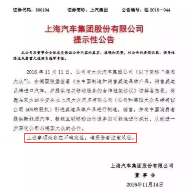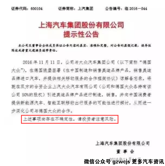 然而,就在大家为一汽-大众奥迪未来处境担忧的时候,剧情发生了惊天翻转——首先在11月14日上汽发布与奥迪合作的公告中,上汽最后明确指出该合作事项存在不确定性,请投资者注意风险。可见,未来仍然存在较大变数,上汽和奥迪的联姻走向如何尚未可知。