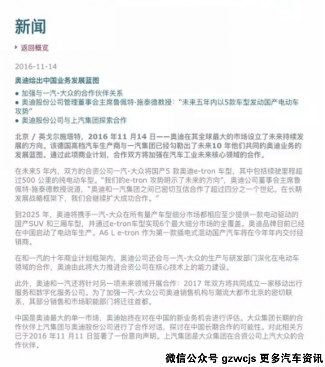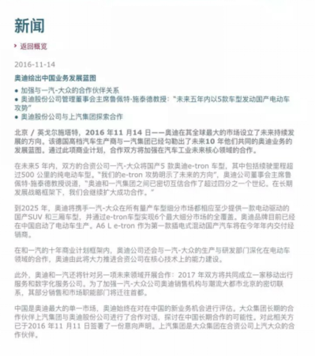 其次就在同一天,奥迪郑重发出与一汽的未来10年合作计划。双方将在电动车、移动出行服务和数字化服务及市场销售等诸多领域展开深入合作。相比于上汽公告的语焉不详,这份声明拳拳到肉,明晰直接得多。