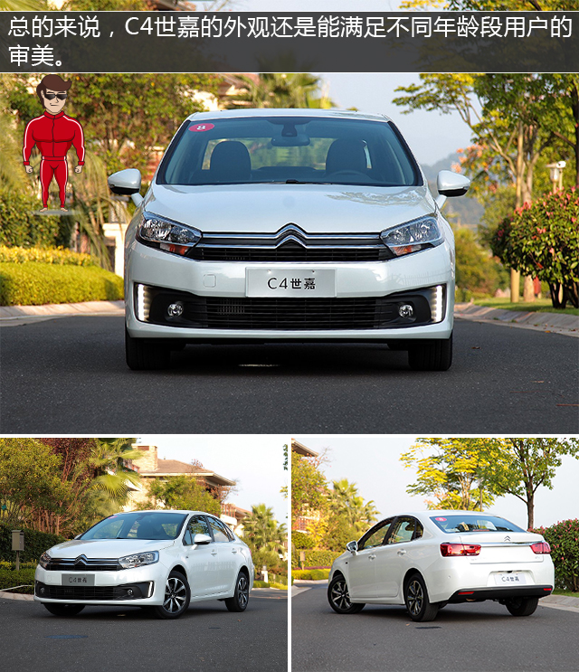 C4世嘉的外观整体上是沉稳而又不失设计感的,大灯-中网-车标一体式的设计颇具特色,看起来也有较强的整体感。侧面的造型则十分简洁,线条都比较柔和,微微上翘的车尾曲线会显得更有设计感。总的来说,C4世嘉的外观还是能满足不同年龄段用户的审美。