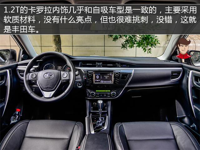1.2T的卡罗拉内饰几乎和自吸车型是一致的,主要采用软质材料,没有什么亮点,但也很难挑刺,没错,这就是丰田车。配置上增加了车身稳定系统和自动启停,这是1.6L的车型所不具备的,让消费者又多了一个选择1.2T的理由。