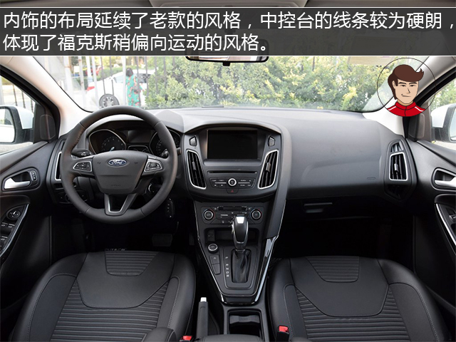 内饰的布局延续了老款的风格,中控台的线条较为硬朗,体现了福克斯稍偏向运动的风格。多媒体系统为第三代的SYNC系统,操控灵敏度比旧款有所提升,配置方面已不再是福克斯的短板,自动启停、并线辅助、车道偏离预警等都能找到。