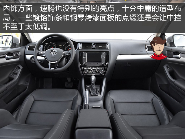 内饰方面,速腾也没有特别的亮点,十分中庸的造型布局,一些镀铬饰条和钢琴烤漆面板的点缀让中控台不至于太低调。十万出头的速腾内饰材料主要还是塑料,但从细节处的接缝可以看出速腾的内饰做工还是挺扎实的。