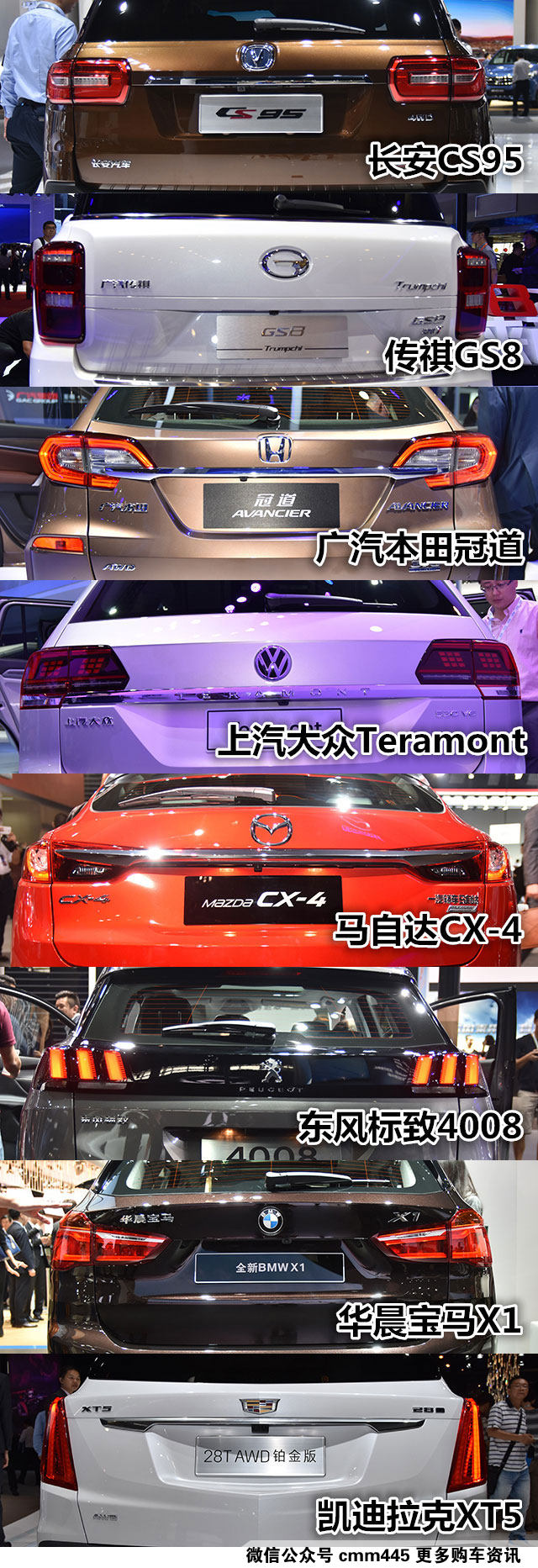 这八款SUV有个性风,有时尚风,有硬朗风,各辆车的“型”都不一样,而刚刚才亮相的上汽大众Teramont,则是吸引了不少人的目光(包括美编小混),虽然外观设计稍微有些保守,但是大尺寸车身看起来很霸气,美编小混是这样说:“好大啊,比XT5还大!”。同样,新亮相的长安CS95相比之前“量”产的CS95确实颜值高了不少,至少吐槽点没那么多了。而对于冠道和GS8,整体设计看起来比较稳重,用美编小混的话说就是:“适合我爸爸”。CX-4和标致4008有个性,整体设计时尚,外观对于一般女孩子也比较适合,当然,美编小混也不例外(看上图表情)。至于宝马X1,外观很大家很熟悉,“两眼睛,两鼻子”,但,美编小混却说:“有宝马的LOGO就够了”。