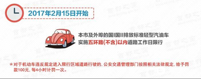 本月21号,环保部发表声明,明年2月起国Ⅰ、国Ⅱ轻型汽油车北京五环内工作日限行。而对于机动车违反规定进入限行区域道路行驶的,相关部门将按照法律规定,给予罚款100元,每4小时计罚一次。