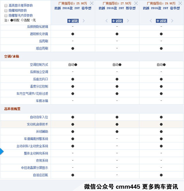 在配置表现,君越表现还是非常厚道,安全装备可是一个也没少,做到了全系标配,除了顶配只是多个膝部气囊,对乘客安全考虑相当周到,这也必须为此点赞!具体见下表:即使是入门级别,在配置上也并不差,无钥匙进入/启动系统、上坡辅助、电动天窗、真皮座椅、主/副驾驶座电动调节、前排座椅加热、发动机启停技术等丰富配置,就算买到入门级别,能享受到配置也相当多。君越的销量也对得起它的诚意!