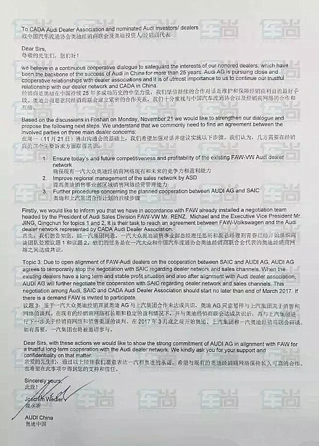 一封由奥迪中国总经理魏永新签署的内部绝密文件显示:
